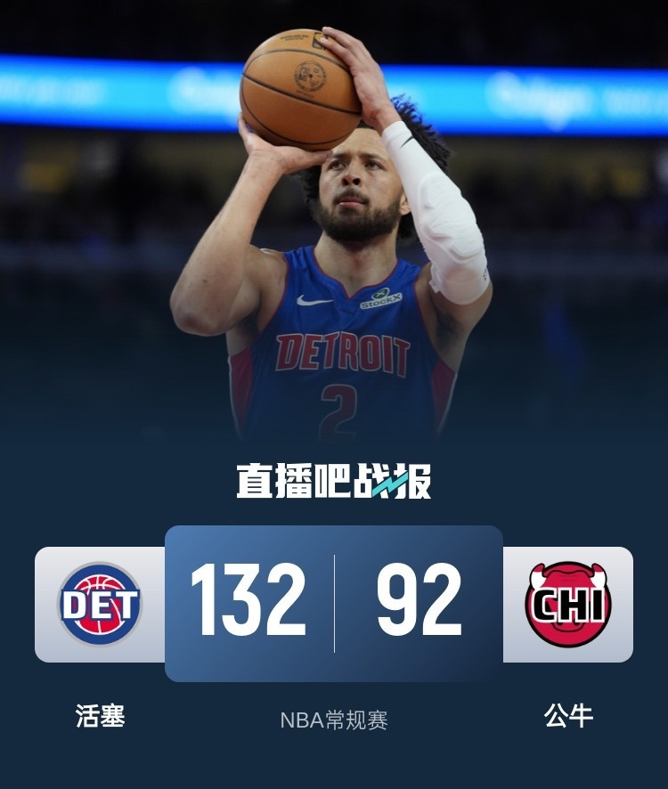 上半场,活塞反客为主率先发力,多点开花很快取得两位数领先,次节公牛依旧低迷,打铁失误不断,活塞火力全开,攻防两端碾压对手一度将优势扩大到45分,半场战罢活塞71-29领先公牛。下半场,公牛进攻回暖,双方围绕40分的分差展开拉锯战,末节成为垃圾时间,最终,活塞132-92狂胜公牛40分。