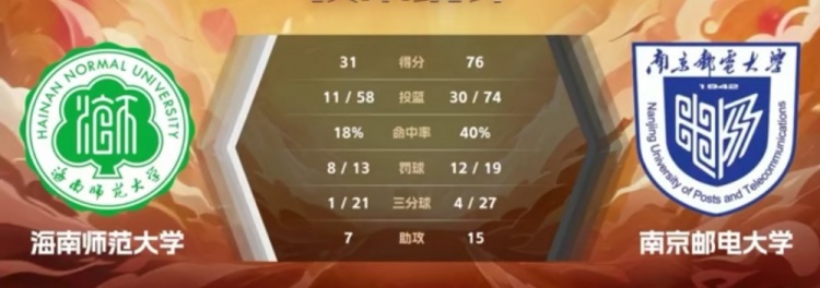 末节比赛,黄晶如意先中三分,林昕投进三分还要加罚,此后两队均陷入得分荒,沙沙补篮打破僵局,陈曦玥篮下打成2+1连得5分,南京邮电命中率下降,最终,南京邮电76-31大胜海南师大。