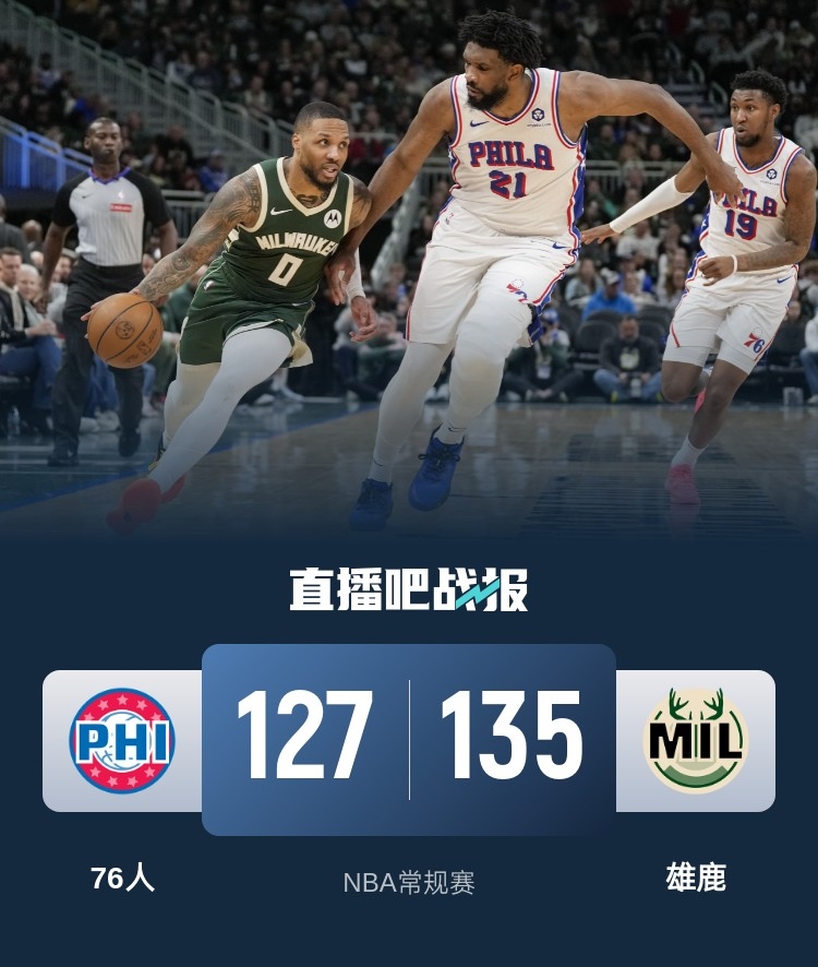 利拉德43+7+8 恩比德27+12+6 马克西39分 雄鹿击退76人